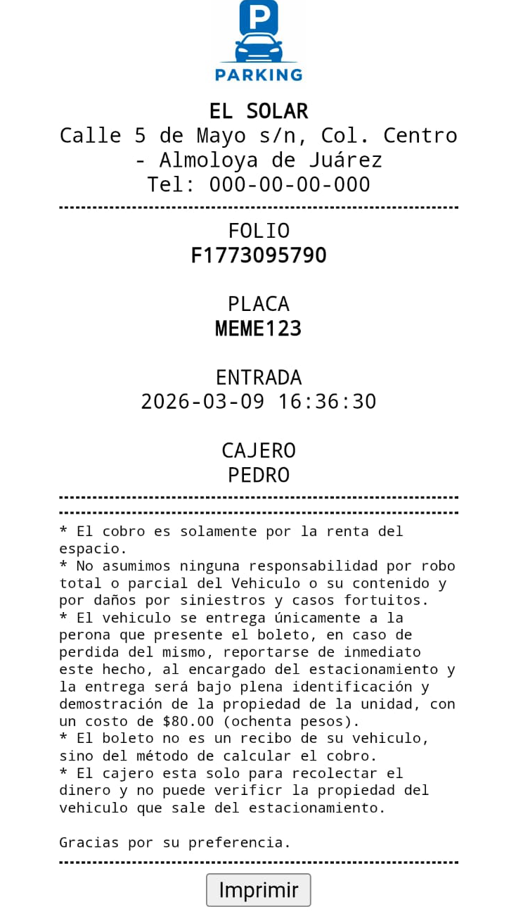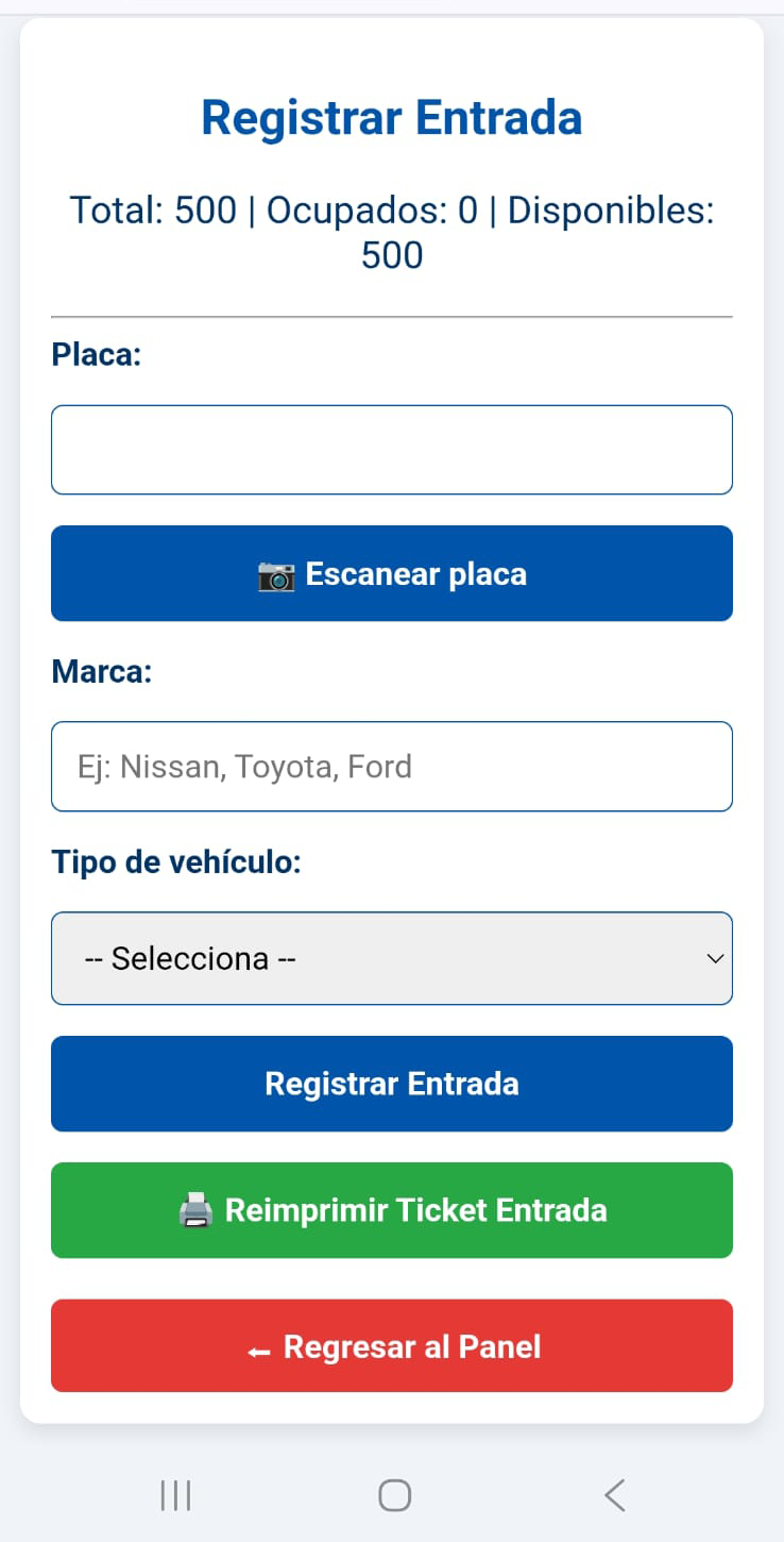 Registro inmediato de vehículos mediante placa o folio. Generación automática de tickets con código QR.